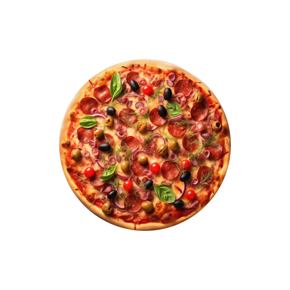 Sauce tomate, double fromage, jambon, lardon, chorizo, olives