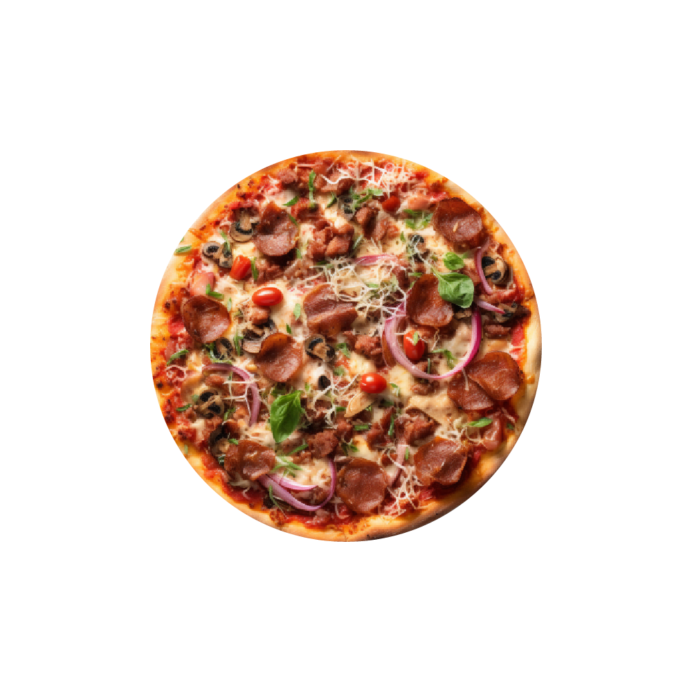 Sauce tomate, crème fraiche, double fromage, bacon grillé, mozzarella, cheddar fondu