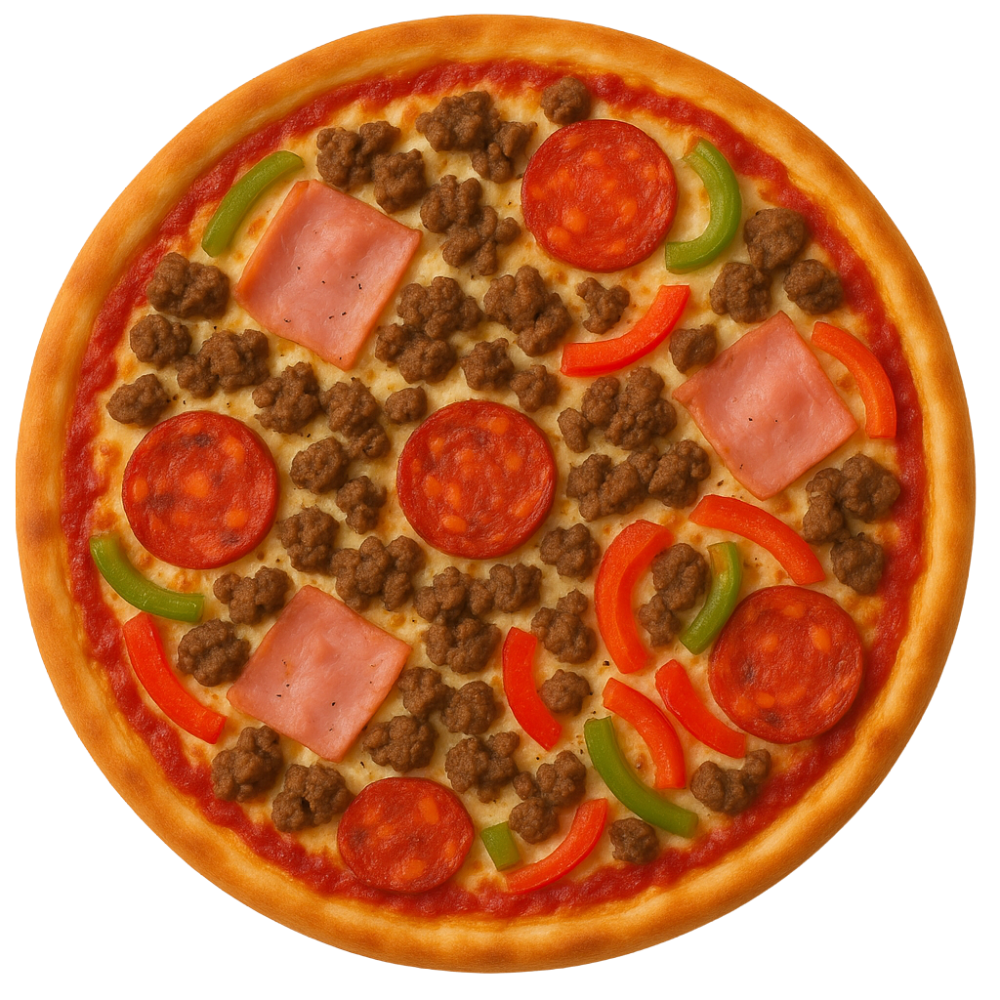 Sauce tomate, double fromage, jambon, viande hachée, chorizo, poivrons