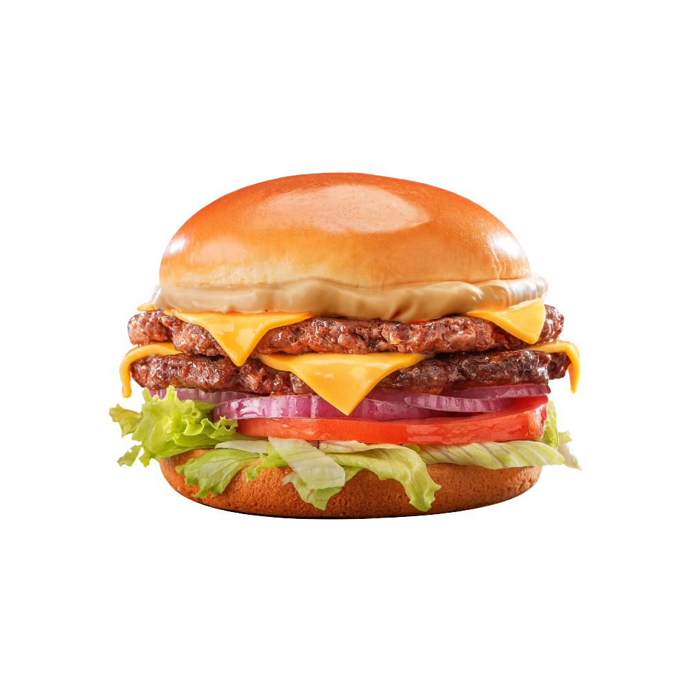 Potato bun brioché, 2 steaks smashés, double cheddar, salade, tomates, oignons, sauce burger classique