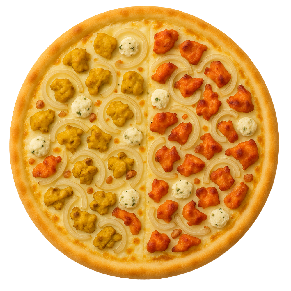 Crème fraîche, double fromage, moitié chicken curry moitié chicken tandoori, oignon, boursin