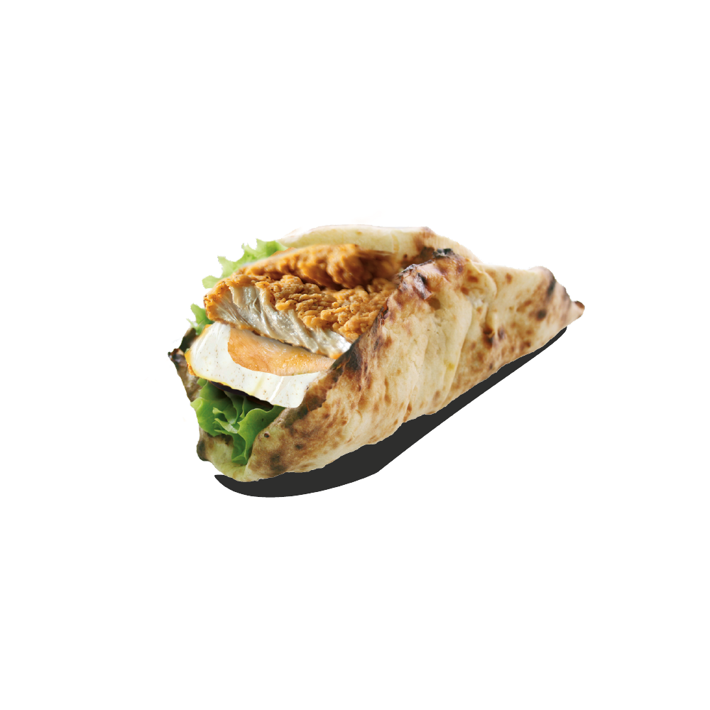 Naan fourré au fromage, escalope, boursin, oignon crispy