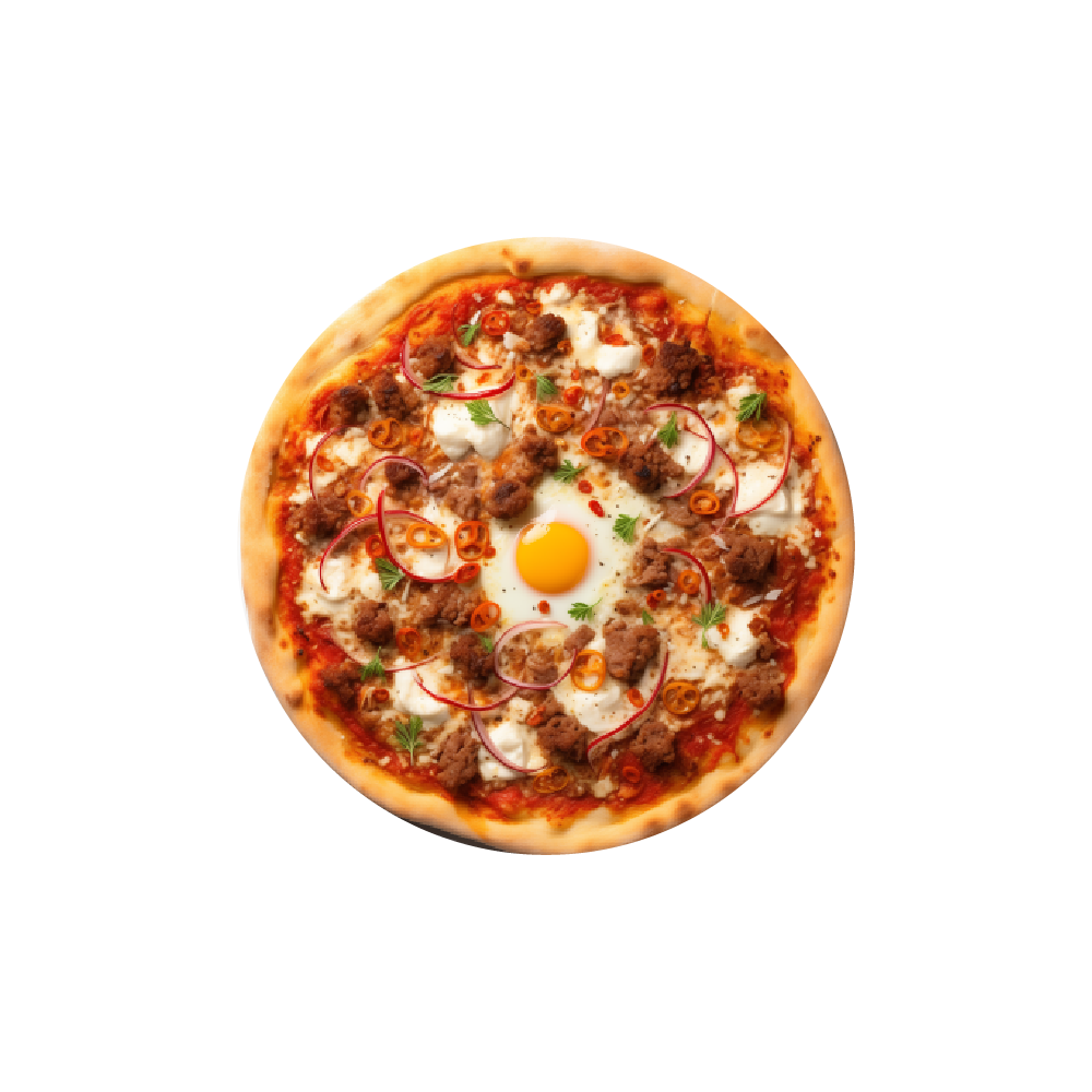 Sauce tomate, double fromage, merguez, bœuf épicé, poivrons, oignons, œuf