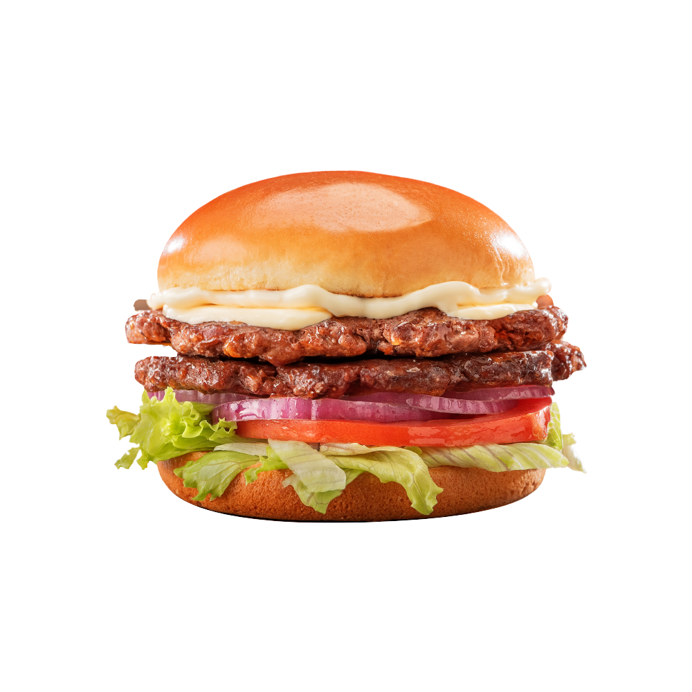 Potato bun brioché, 2 steaks smashés, tranche de fromage bleu, salade, tomates, oignons rouges, sauce mayonnaise à l’ail