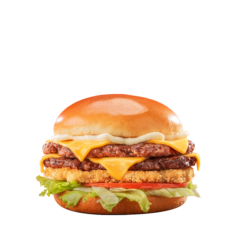 Potato bun brioché, 2 steaks smashés, double cheddar, mozzarella sticks, salades, tomates, sauce maison