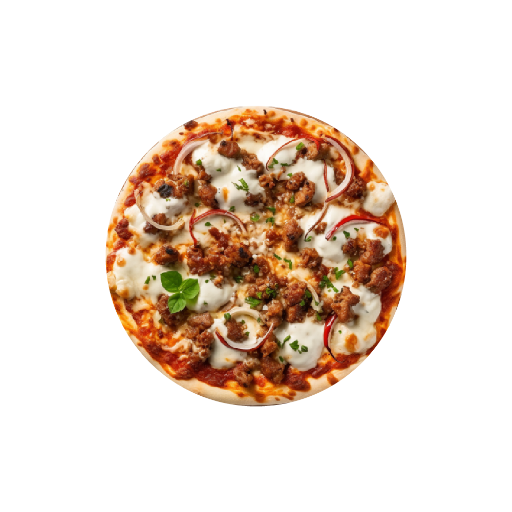 Crème fraîche, sauce barbecue, double fromage, poulet, merguez, bœuf épicé