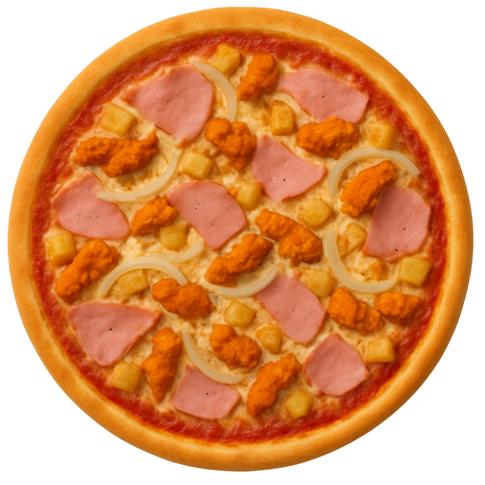 Sauce tomate, double fromage, jambon, chicken tandoori, oignons, pomme de terre